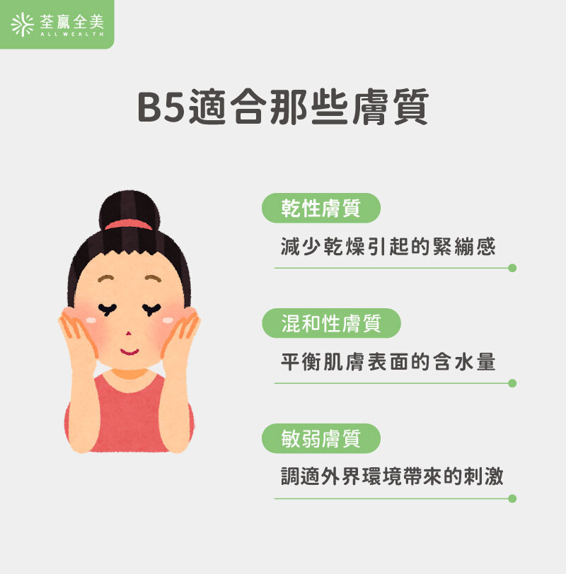B5(泛醇)因為溫和親膚、滲透性良好,是許多膚質都能安心使用的成分。