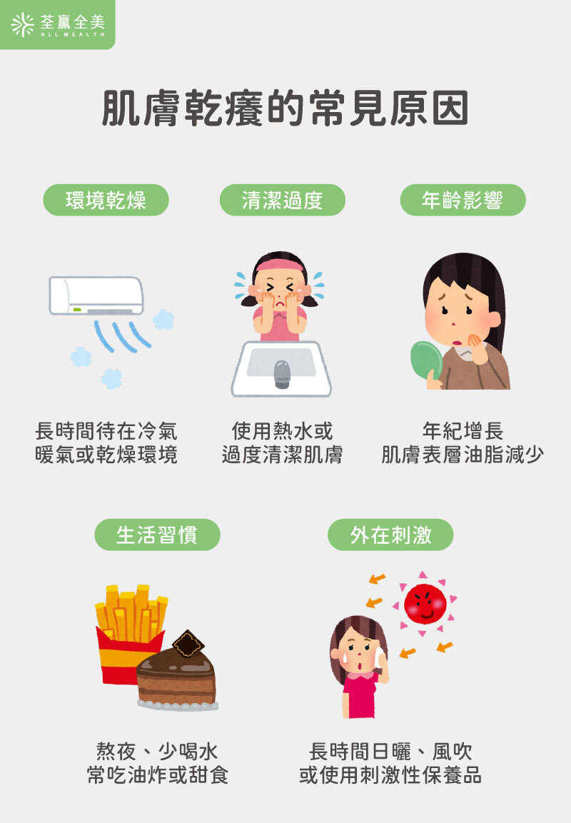 肌膚乾癢多半來自環境、清潔方式、年齡或生活習慣。只要做好保濕、溫和清潔,再搭配生活小習慣調整,就能讓肌膚維持水潤舒適!