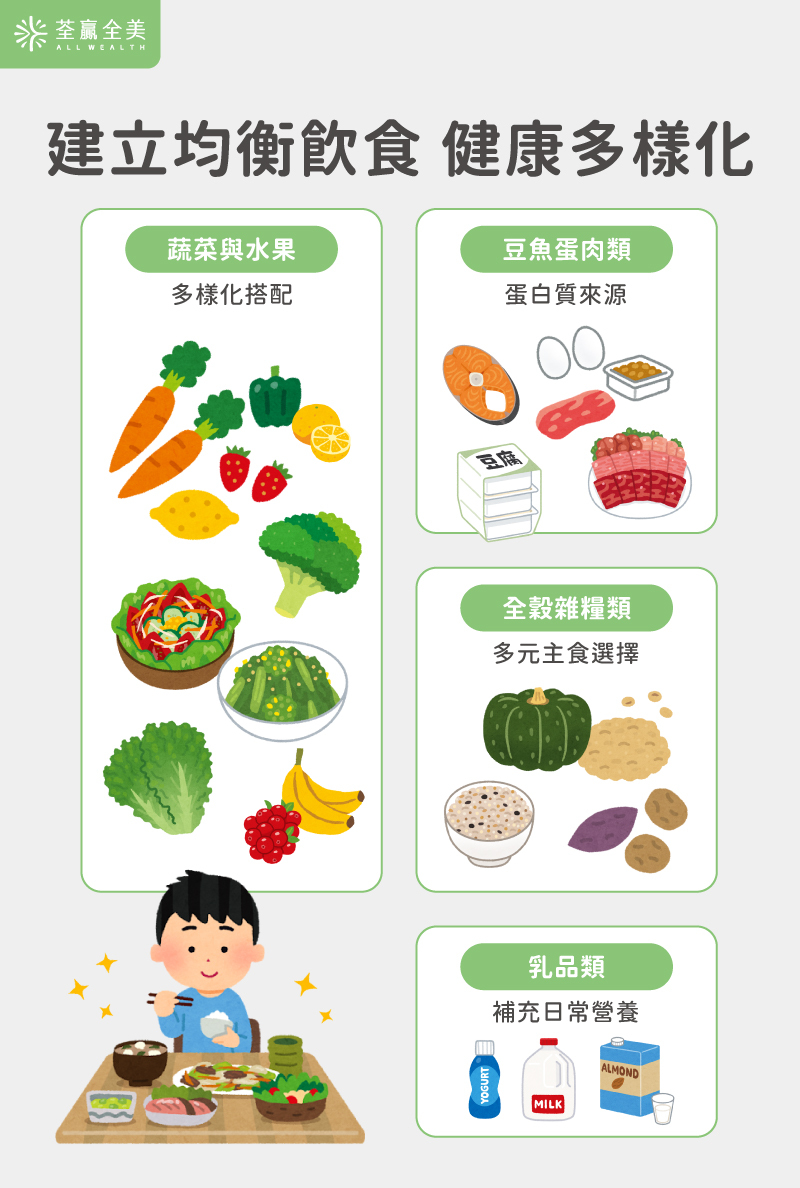 均衡飲食是全家營養的基礎,建議以多類食材、多種配色為原則,讓每餐都能涵蓋五大類食物:全穀類、豆魚蛋肉類、乳品類、蔬菜類、水果類,讓整體營養更全面,而不是只依賴單一類別的食物來源。