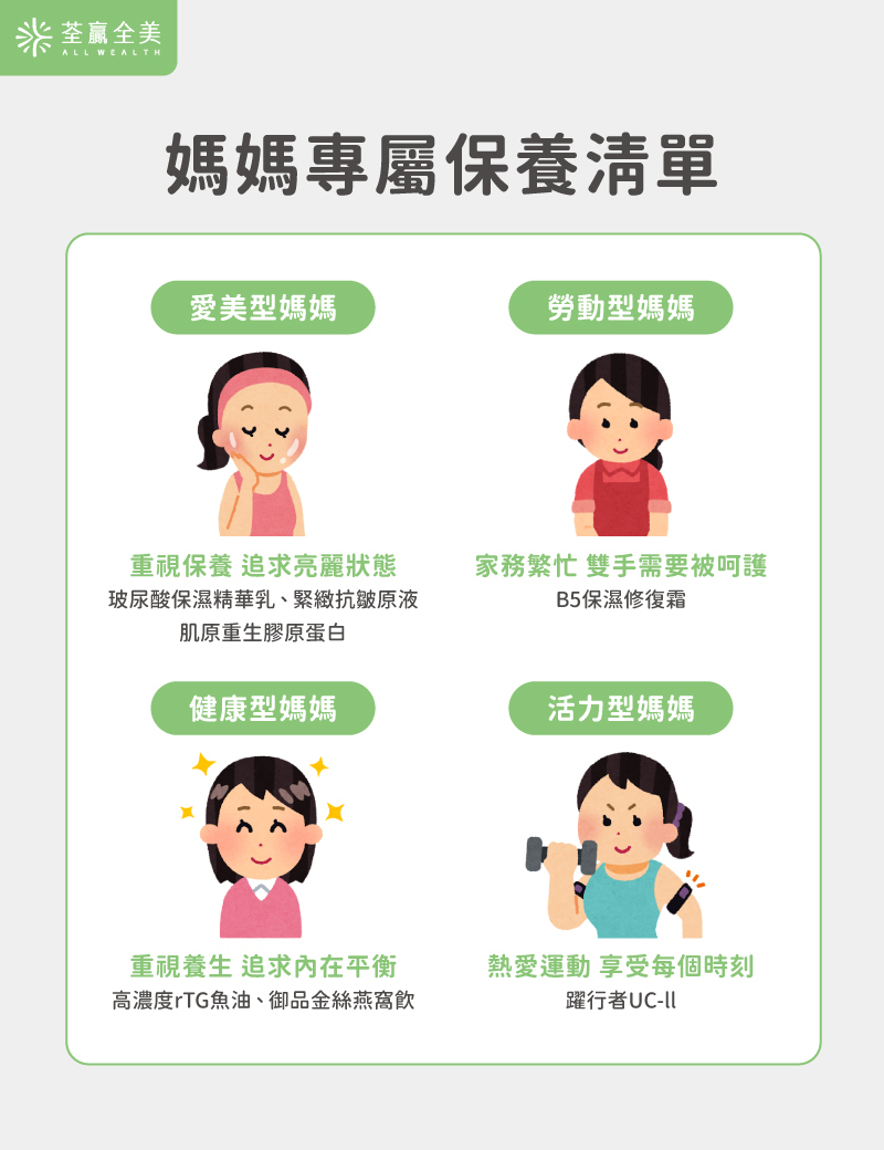 如果媽媽平時注重外在保養,喜歡嘗試各式美妝與保養品,那麼「玻尿酸保濕精華乳」、「緊緻抗皺原液」或「肌原重生膠原蛋白」都是理想選擇,從外在保養到內在補給,幫助維持肌膚彈潤與光澤,讓美麗隨時間優雅延續。