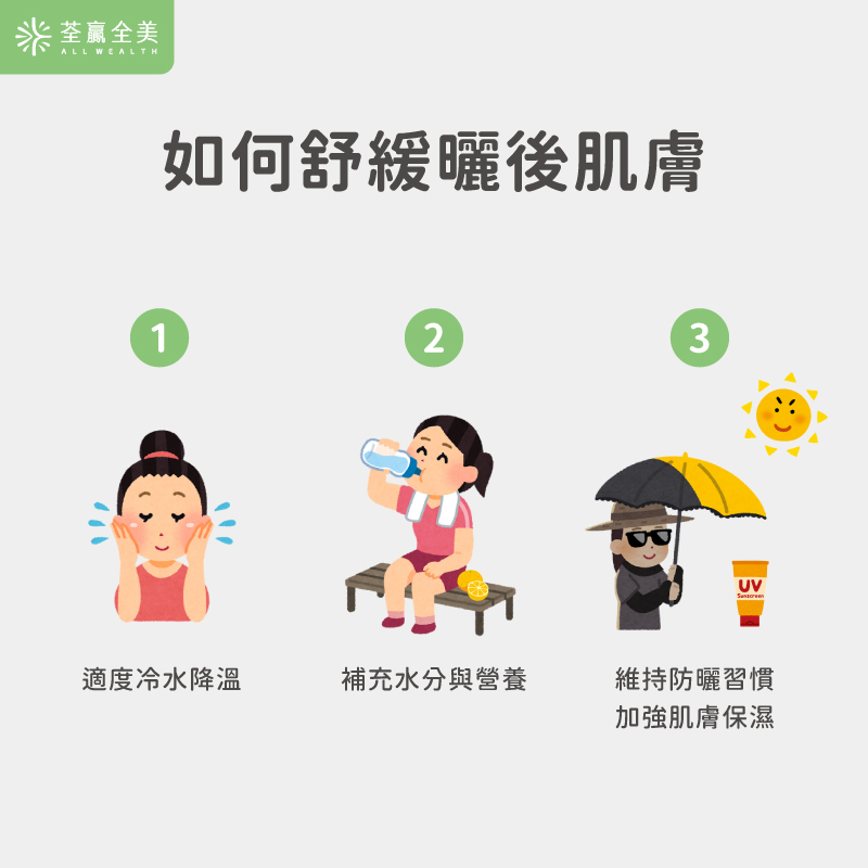 適度冷水降溫:曬後可使用冷水輕拍或冷敷,協助皮膚降溫,避免過度摩擦。