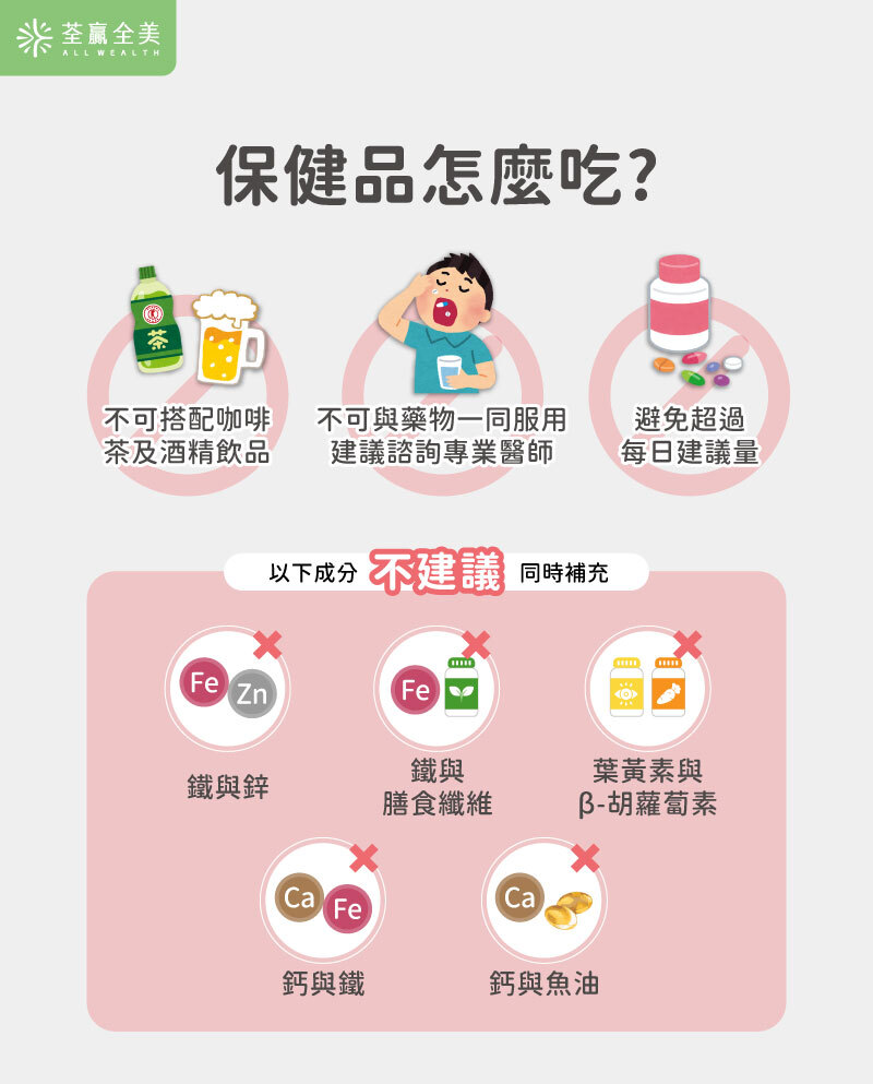 有些營養素同時補充時,可能會影響彼此的利用率,因此以下成分不建議同時補充: