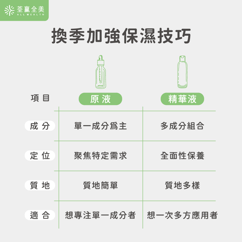 依季節調適:乾燥時期可以多一道保濕原液,炎熱季節則減少用量,保持肌膚舒適與平衡。