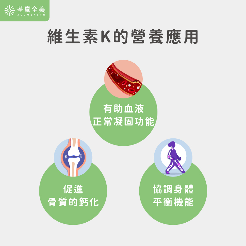 小提醒:不同來源的K1與K2在體內作用時間略有差異,日常可均衡攝取。