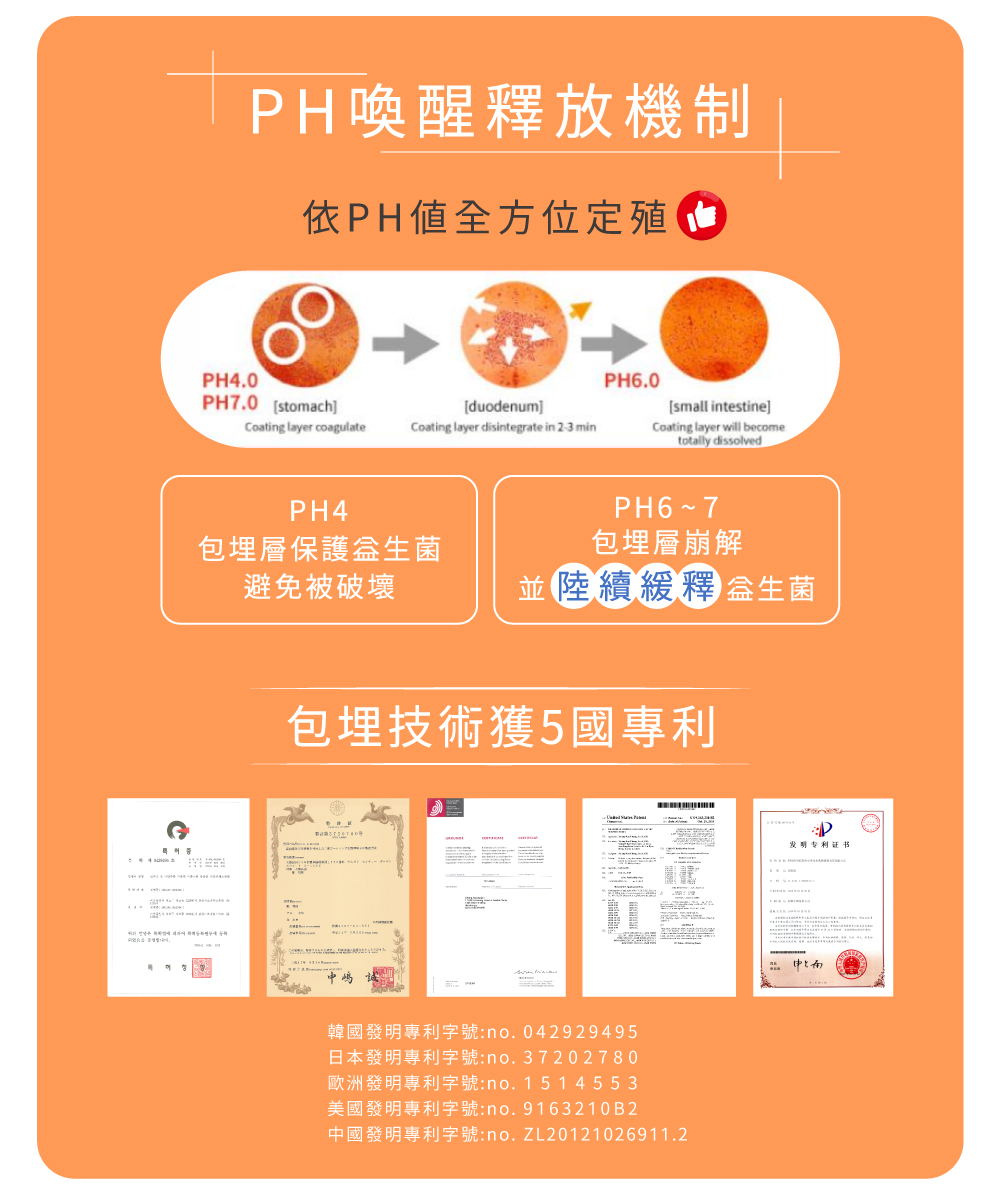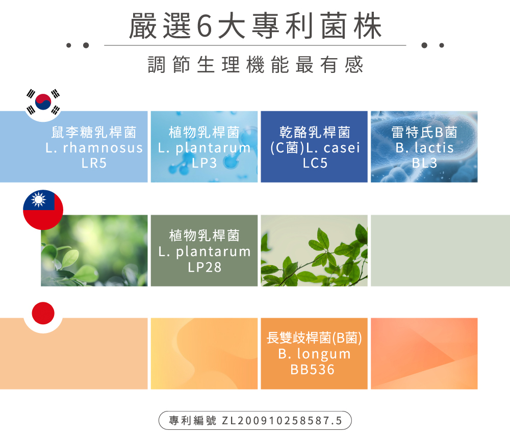 ⦁ 韓國專利四合一益生菌、台灣專利LP28植物乳桿菌、日本專利長雙歧桿菌