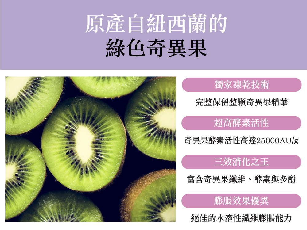 ⦁ 奇異果三效精華,富含奇異果纖維&酵素&多酚