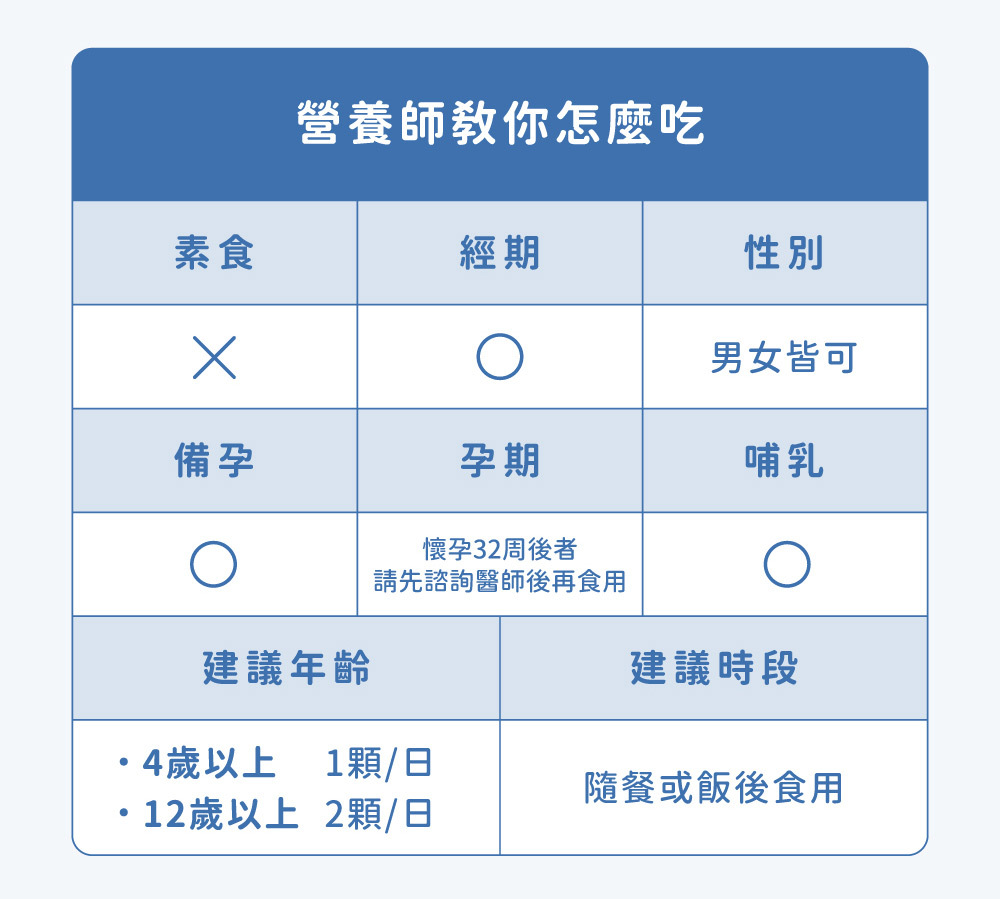 哺乳、備孕期間可食用,懷孕32周以上者請先諮詢醫師後再食用。