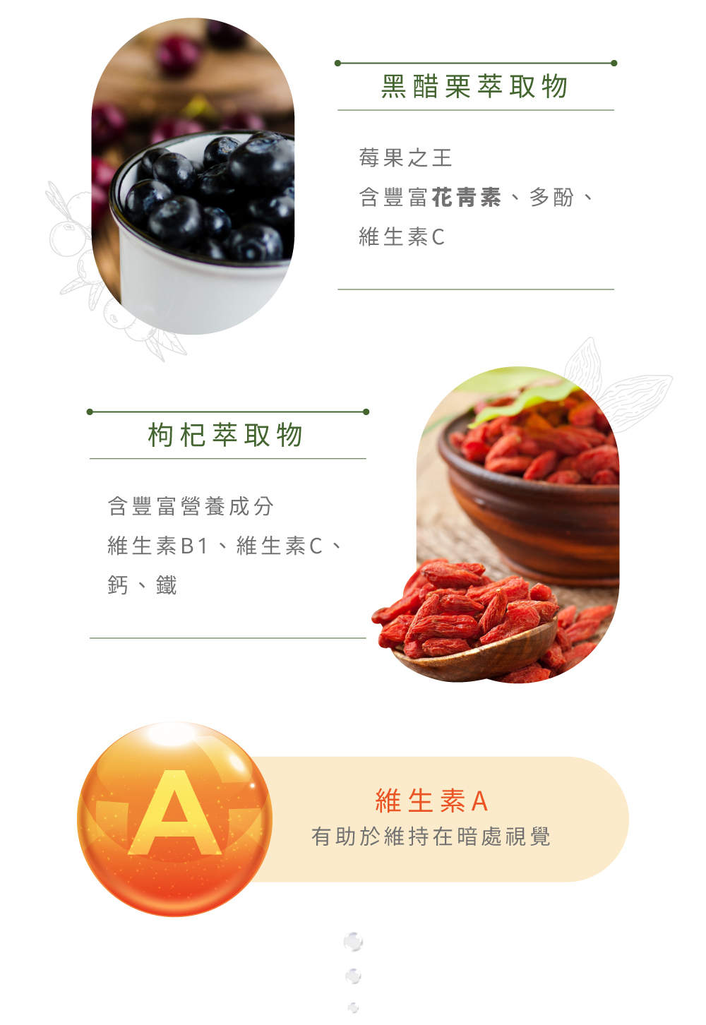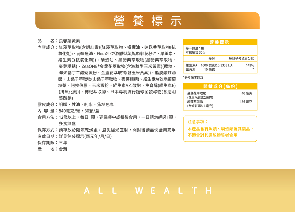 並添加以色列蝦紅素、日本專利透明質酸鈉、花青素、魚油、磷蝦油、枸杞、維生素A...等複方,