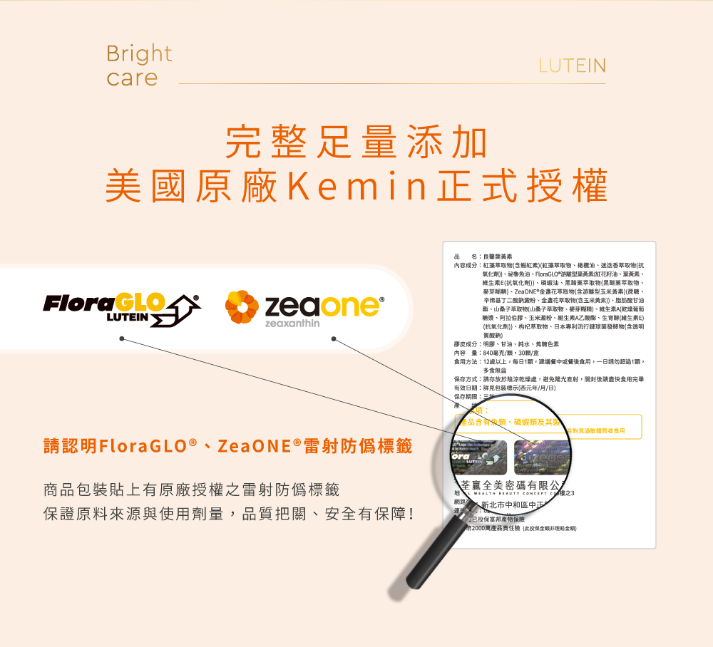 良馨葉黃素選用來自美國Kemin公司的FloraGlo®游離型葉黃素,為全球市售第一的葉黃素品牌,