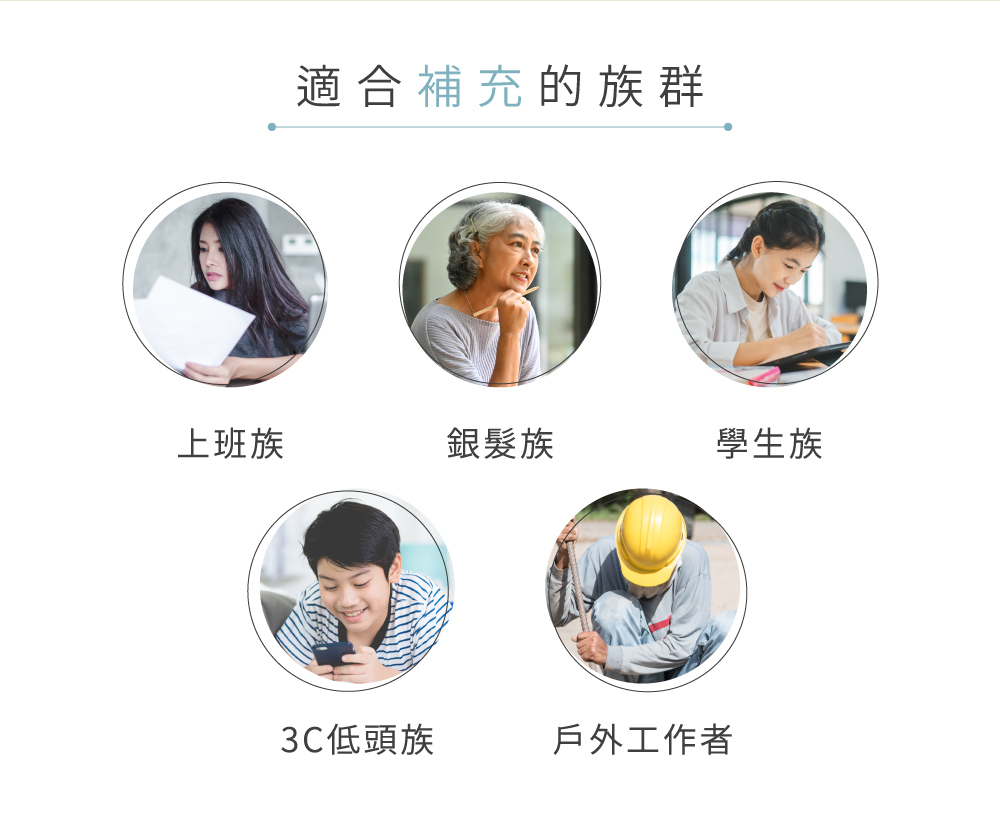 3C低頭族、辦公室上班族、學生族群、長時間閱讀者、長途開車者、銀髮族保健、常處戶外工作者。
