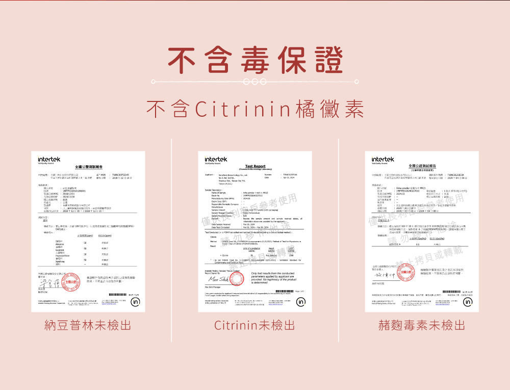 本產品使用天然發酵 Monacolin K,不含 Citrinin橘黴素,安全無副作用。​