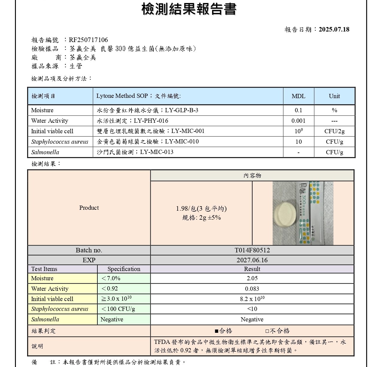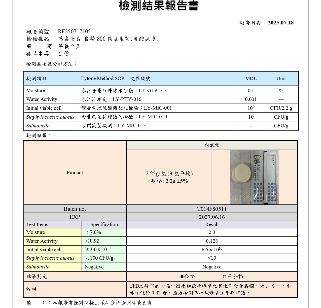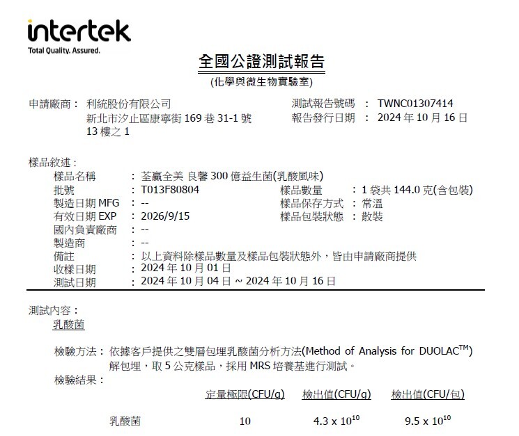 📄良馨300億益生菌-乳酸風味-李斯特菌 / 沙門氏桿菌 / 金黃色葡萄球菌(報告編號:AFA25302823)
