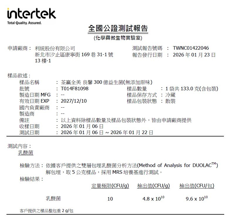 📄良馨300億益生菌-無添加原味-出廠菌數960億(每包/2公克)(報告編號 TWNC01422046)