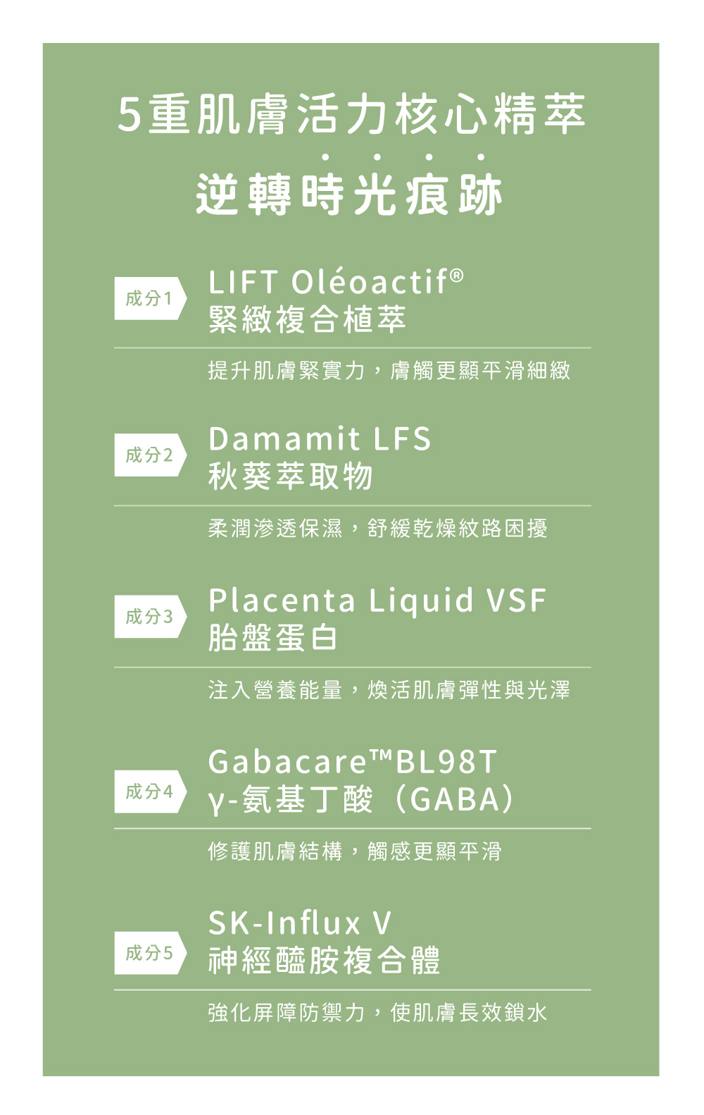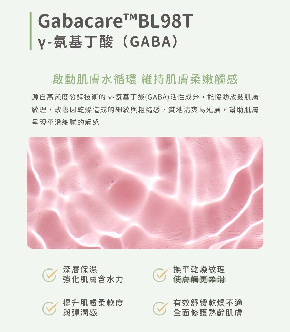 ⦁ Gabacare™BL98T γ-氨基丁酸(GABA),強化肌膚柔韌力,肌膚觸感更柔滑細緻 ​