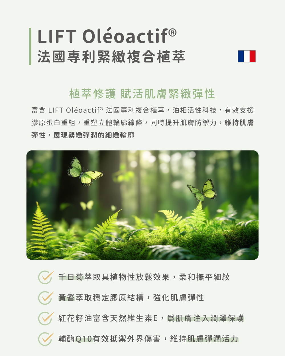 ⦁ 法國專利LIFT Oléoactif®緊緻複合植萃,有助提升肌膚緊實度,重塑緊緻輪廓​