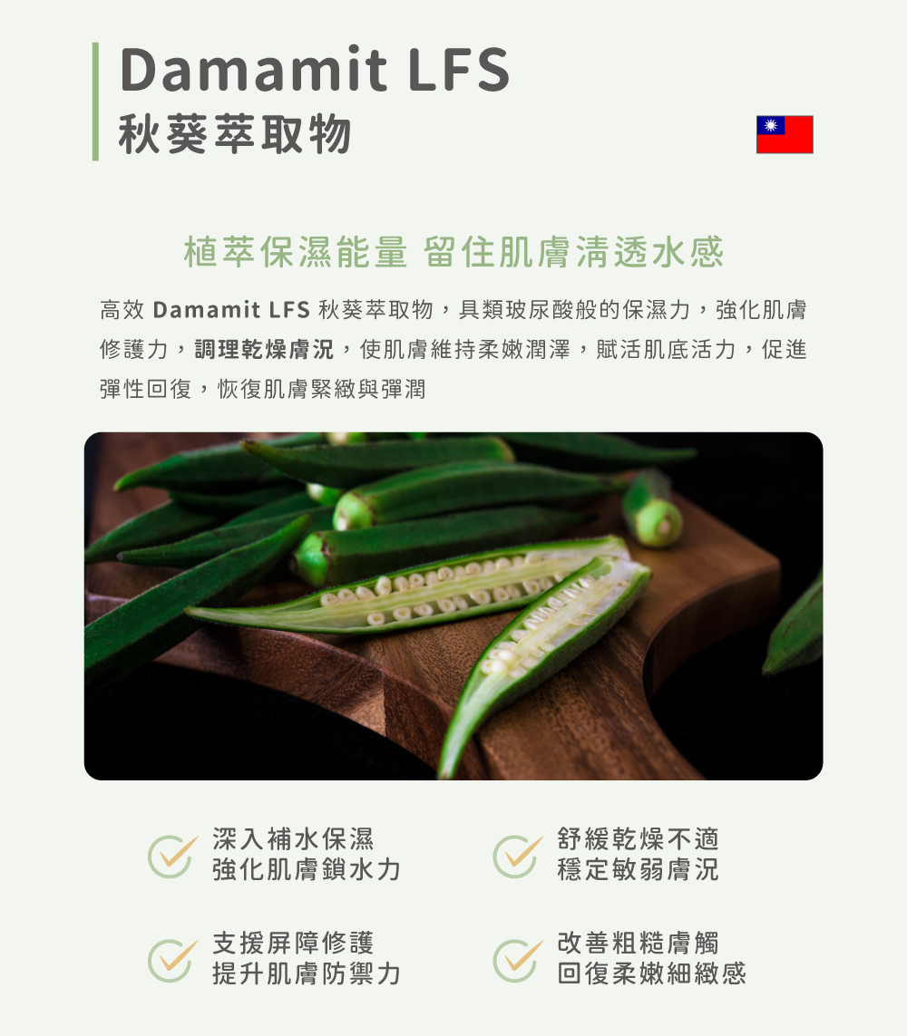 ⦁ Damamit LFS 秋葵萃取物,柔潤補水,減少乾燥引起的細紋​
