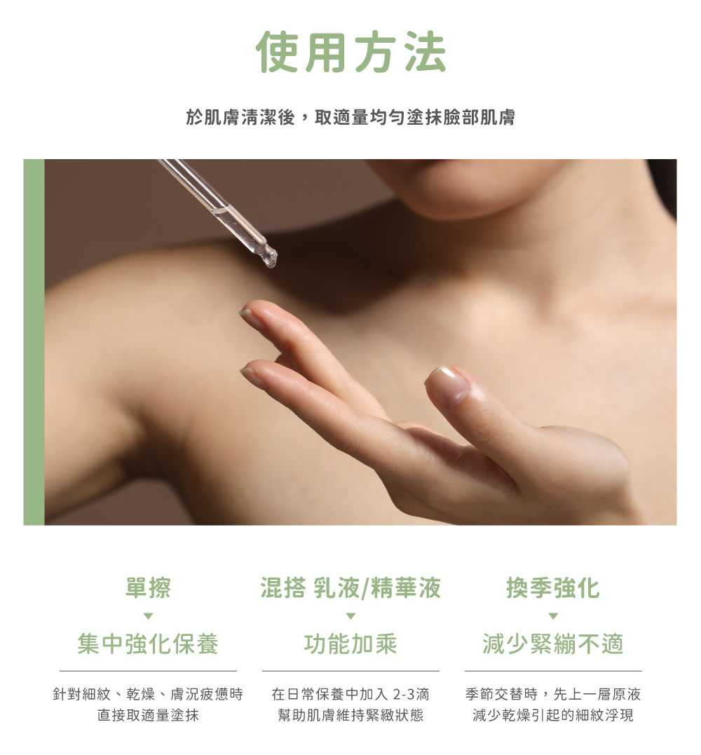 建議於化妝水後、乳液或乳霜前使用,作為精華階段使用效果最佳。​​