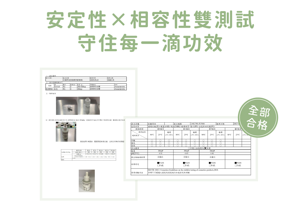 ⦁ 全產品均通過安定性及相容性雙測試,穩定保存精華