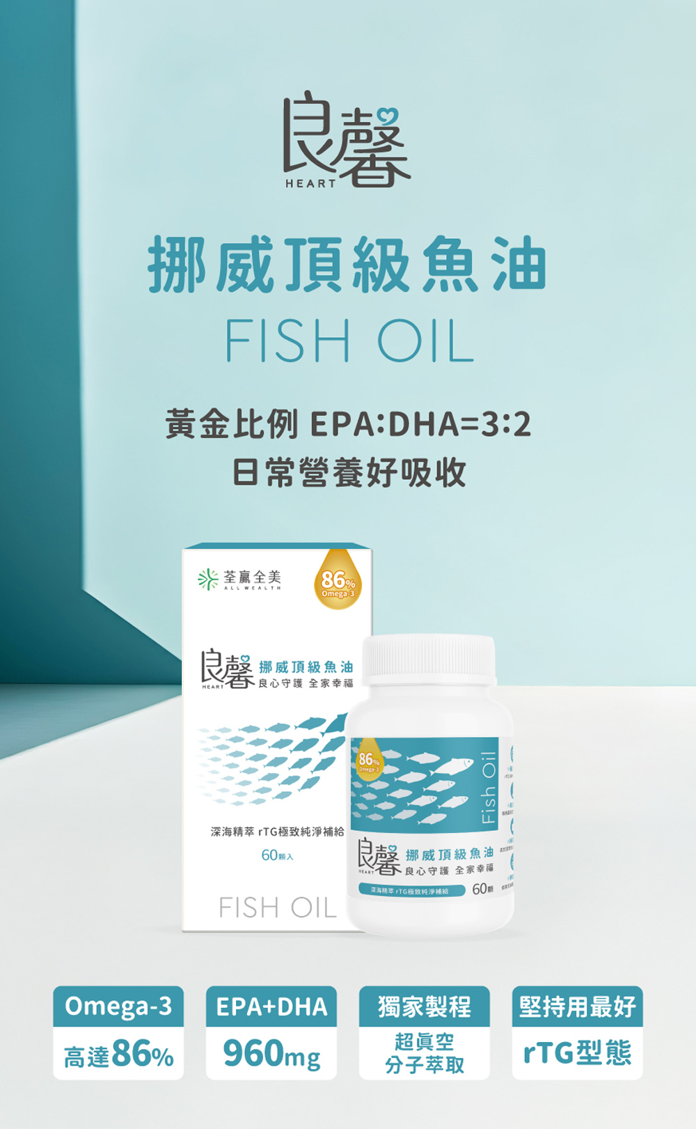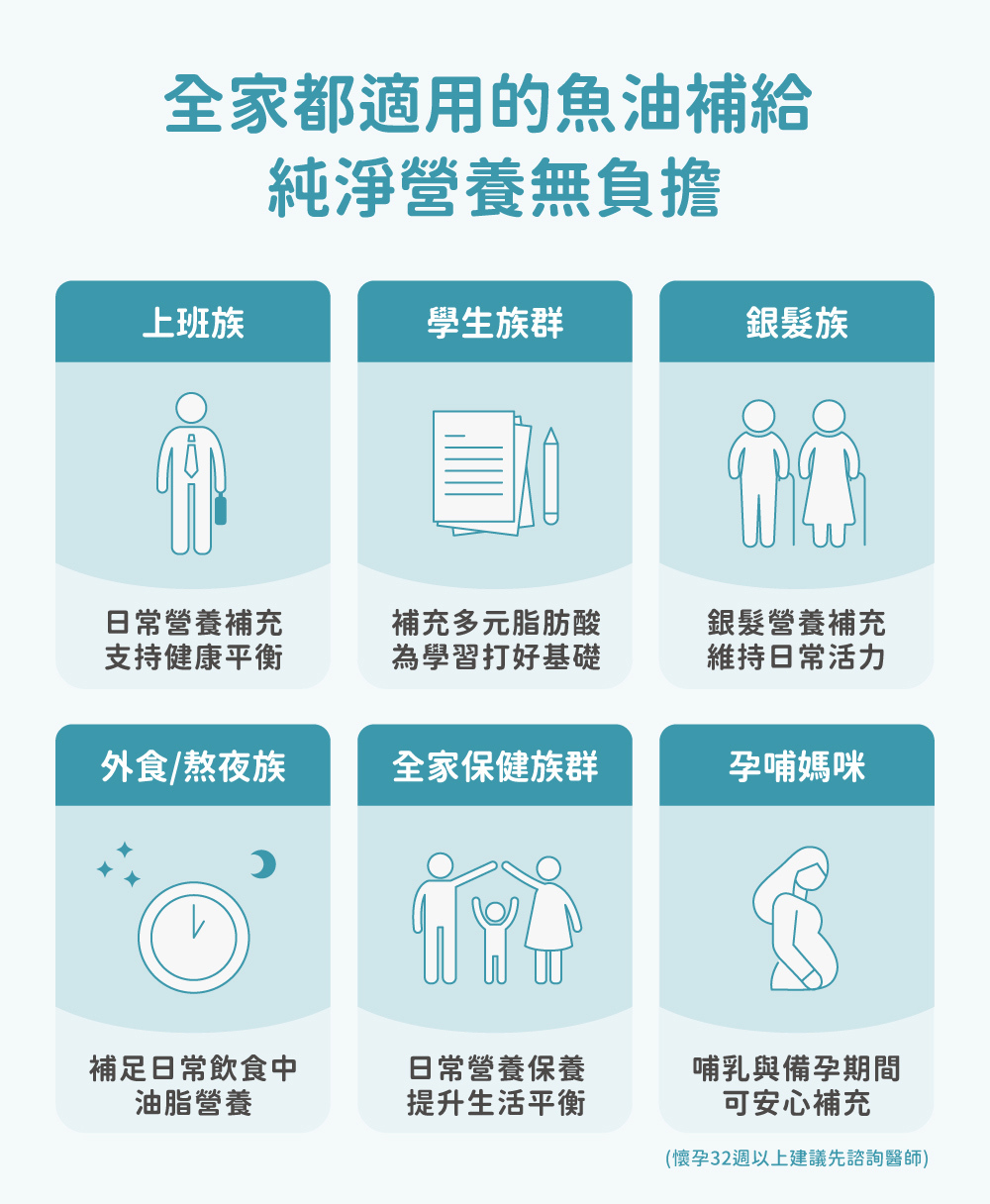 魚油適合全年齡人食用,魚油主要由EPA和DHA兩大營養組成,Omega-3脂肪酸人體無法自行合成,需透過飲食或保健品攝取,良馨挪威頂級魚油中含有豐富高純度高濃度Omega-3,有助於健康維持。 ​