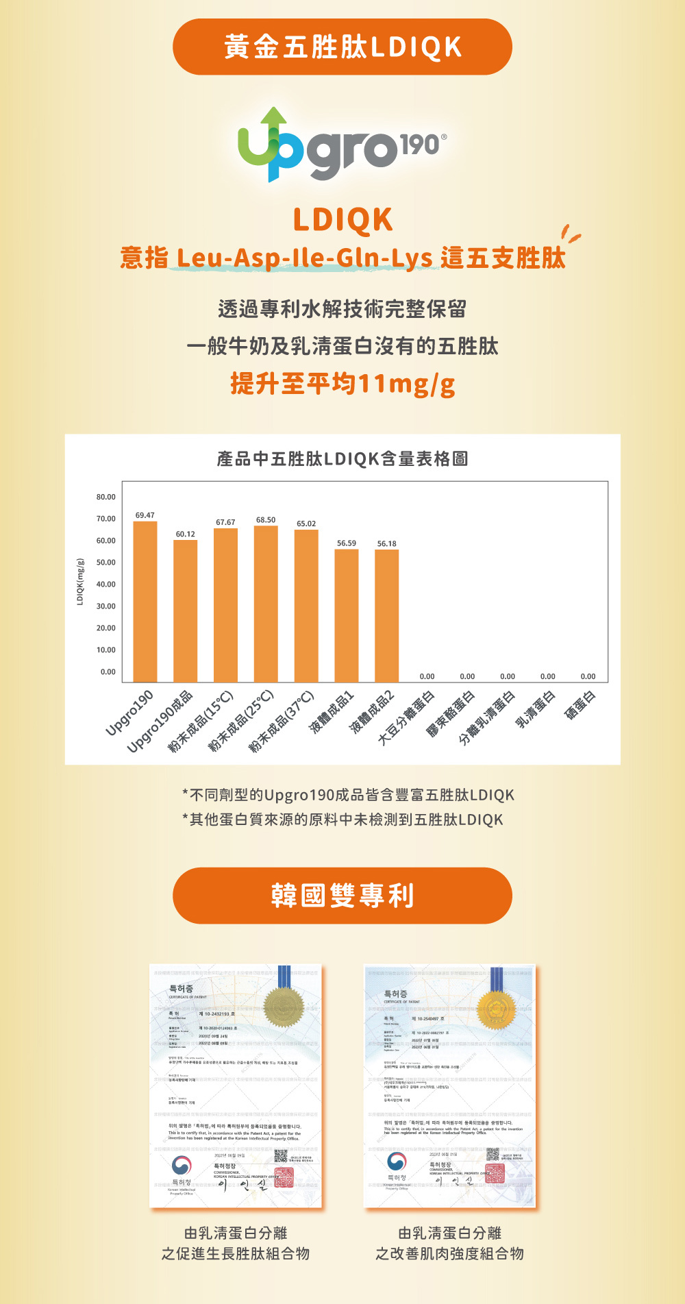 ⦁ 韓國專利Upgro190® 獨有黃金五胜肽 LDIQK