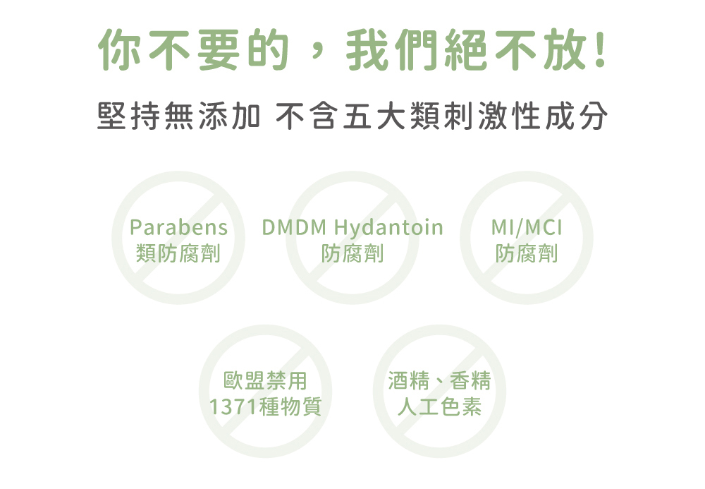 ⦁ 不含香料、色素、酒精及TFDA化粧品禁用物質